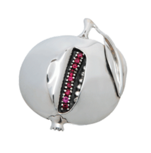 An ancient symbol found carved into the lintels of the earliest synagogues, the pomegranate has carried with it the concepts of Judaism for generations. In the Torah, the pomegranate is one of the seven species that the spies saw in the land when they were sent forth by Moses. The Midrash tells us that the pomegranate has 613 seeds, which corresponds with the number of mitzvot or commandments found in the Torah. The pomegranate has been woven into ancient fabrics and hammered into ceremonial silver and gold objects. The intricate covers for the handles of the Torah scrolls are called rimonim or pomegranates.